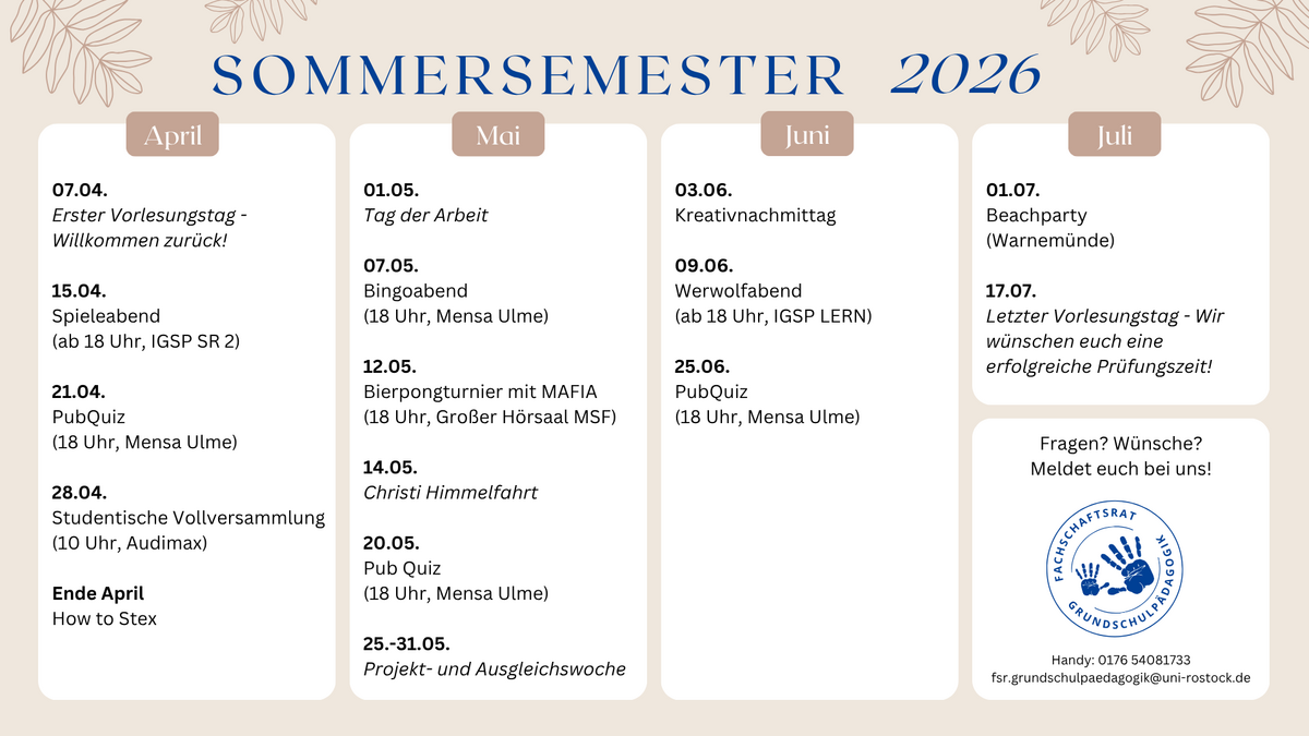 - Anmeldung: per Mail an fsr.grundschulpaedagogik@uni-rostock.de
